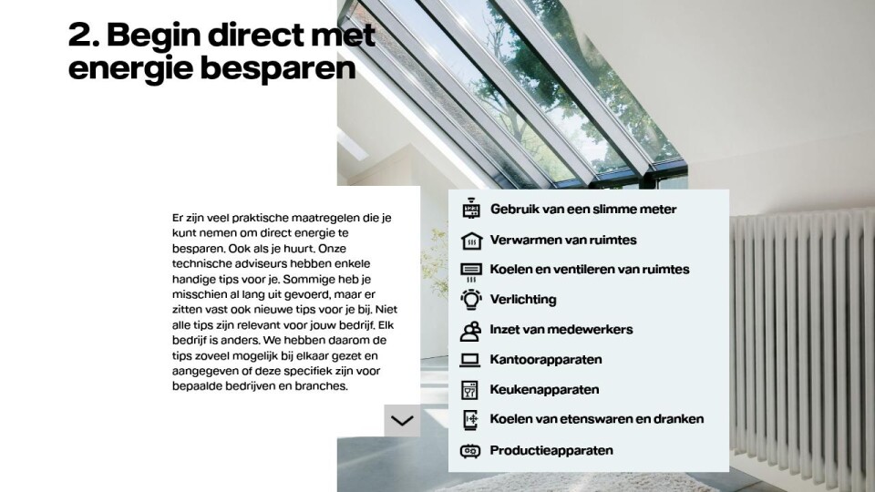 Er zijn veel praktische maatregelen die je kunt nemen om direct energie te besparen. Ook als je huurt. Onze technische adviseurs hebben enkele handige tips voor je. Sommige heb je misschien al lang uit gevoerd, maar er zitten vast ook nieuwe tips voor je bij. Niet alle tips zijn relevant voor jouw bedrijf. Elk bedrijf is anders. We hebben daarom de tips zoveel mogelijk bij elkaar gezet en aangegeven of deze specifiek zijn voor bepaalde bedrijven en branches.