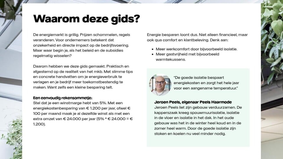 Daarom hebben we deze gids gemaakt. Praktisch en afgestemd op de realiteit van het mkb. Met slimme tips en concrete handvatten om je energieverbruik te verlagen en je bedrijf meer toekomstbestendig te maken. Want zelfs een kleine besparing telt.